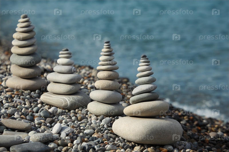 Пирамиды из камней на галечном пляже