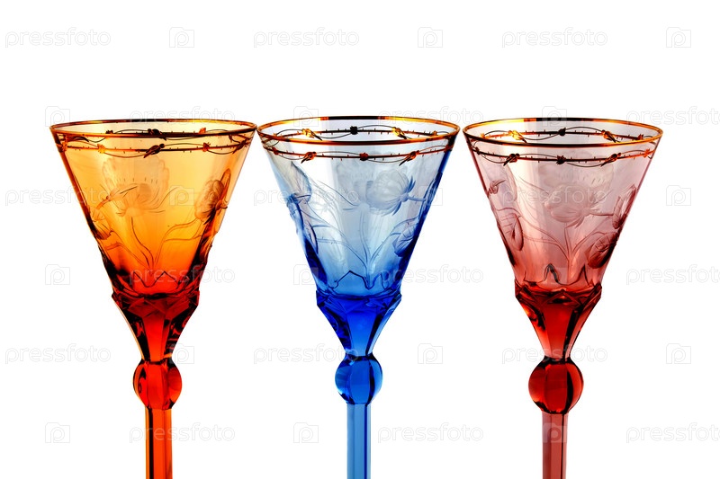 Изящные цветные бокалы для вина на белом фоне
