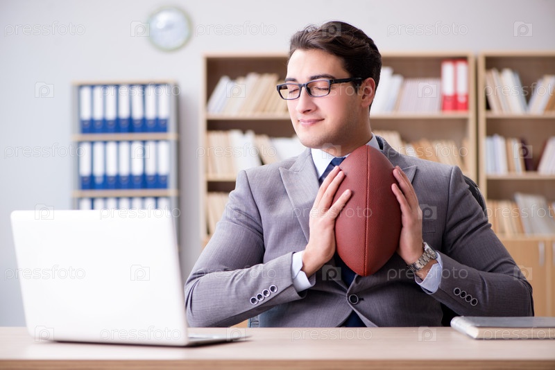 Бизнесмен с американским футбольным мячом в офисе