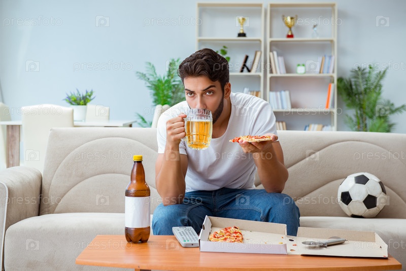 Человек ест пиццу с пивом