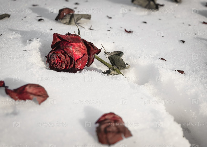 Красная роза лежит на снегу