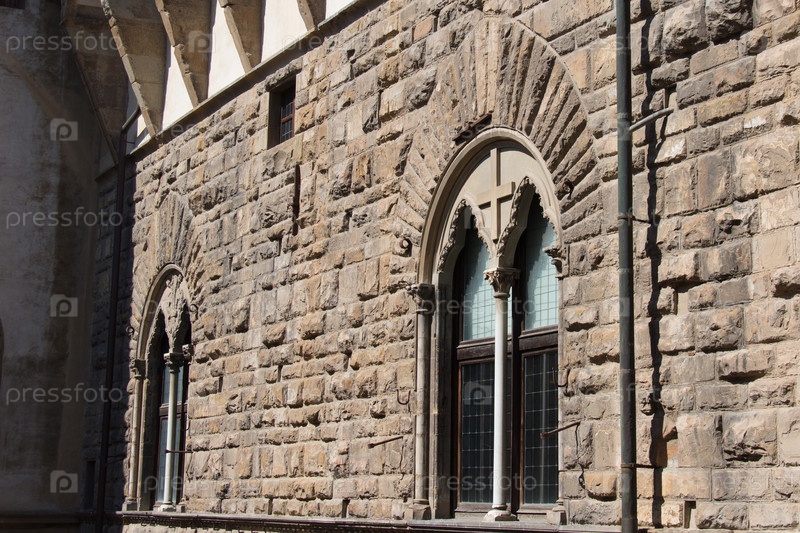 Окна средневекового флорентийского здания. Вид с вершины Палаццо Веккьо, Флоренция, Тоскана, Италия