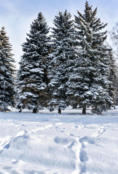 Ель возле скамейки в городском парке