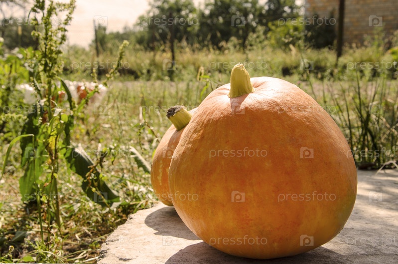 Желтая тыква на фоне сада