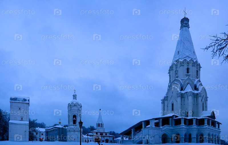 Зимний вид на церковь Вознесения после снегопада в Коломенском, Москва, Россия
