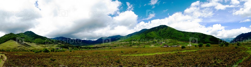 Пейзаж горной долины Фобхихи в Гималаях, Бутан