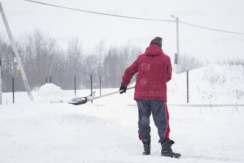 Человек убирает снег на участке