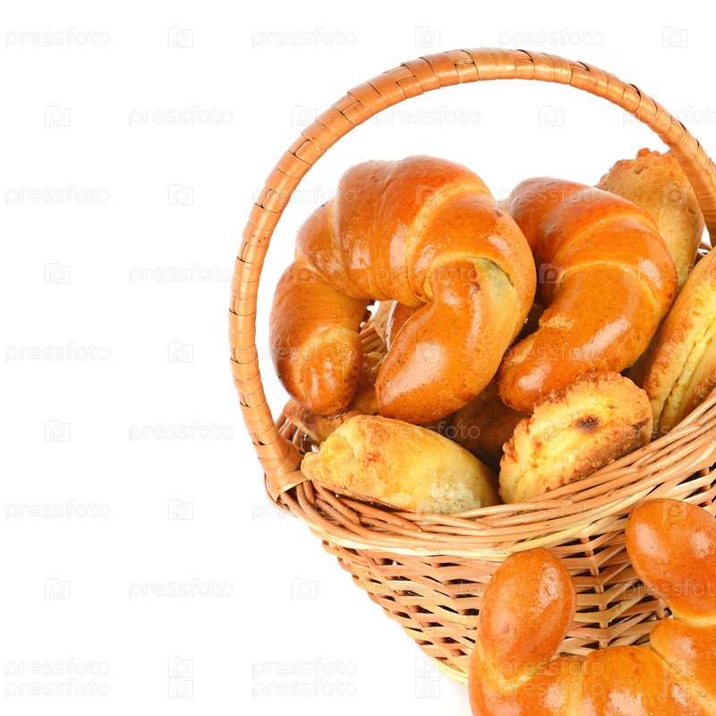 Круассаны и творожные булочки в плетеной корзине на белом фоне
