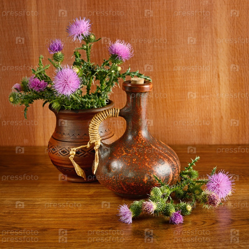 Кувшин и цветы расторопши на деревянном