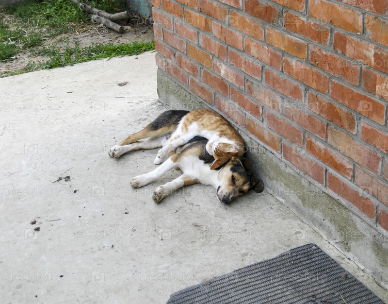 Кот спит на собаке