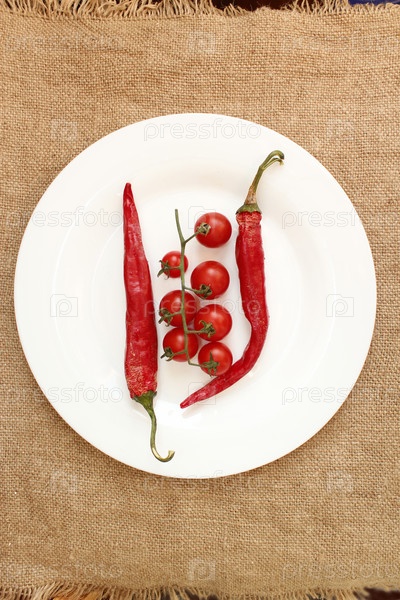 Помидоры и стручки перца чили на тарелке
