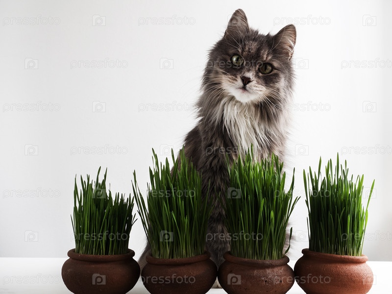 Котенок и зеленая трава в горшках на белом фоне
