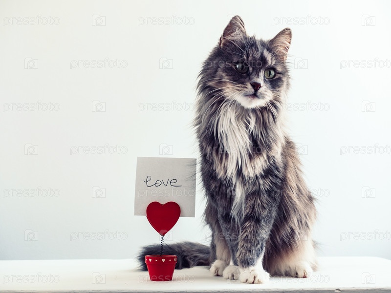 Очаровательная, пушистая кошка рядом с держателем для бумаг в виде сердца