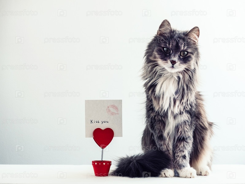 Очаровательная, пушистая кошка рядом с держателем для бумаг в виде сердца
