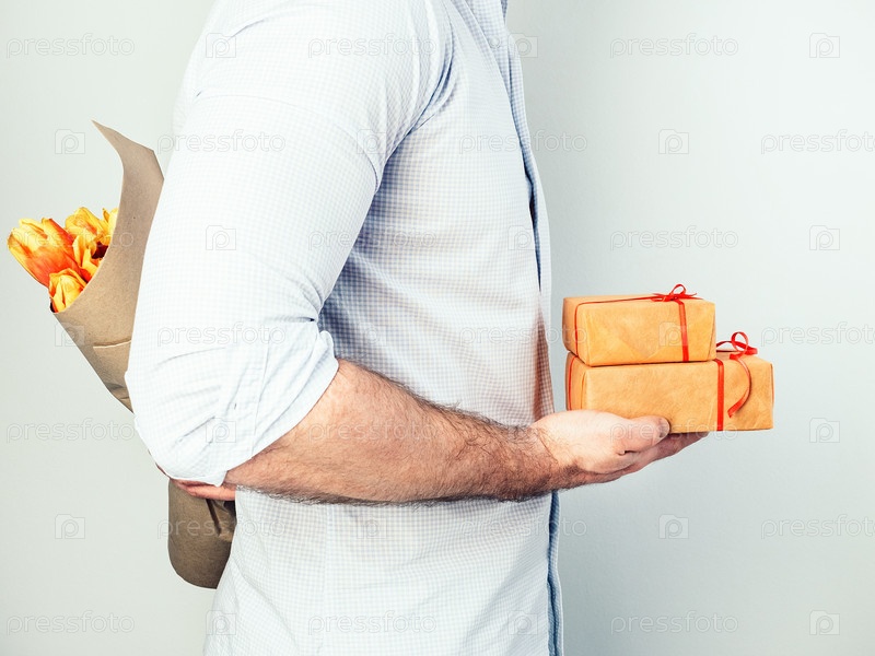 Мужчина с подарками и цветами для любимой