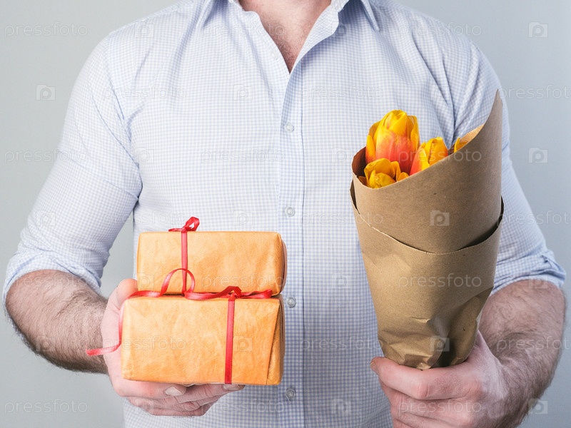 Мужчина с подарками и цветами для любимой
