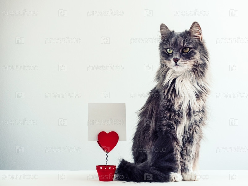 Очаровательная, пушистая кошка рядом с держателем для бумаг в виде сердца