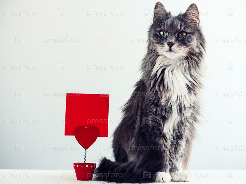 Очаровательная, пушистая кошка рядом с держателем для бумаг в виде сердца