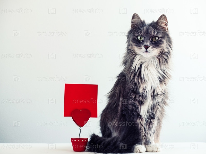 Очаровательная, пушистая кошка рядом с держателем для бумаг в виде сердца
