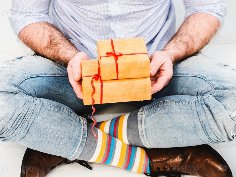 Красивый мужчина в смешных носках и стильных туфлях с подарком для своей любимой