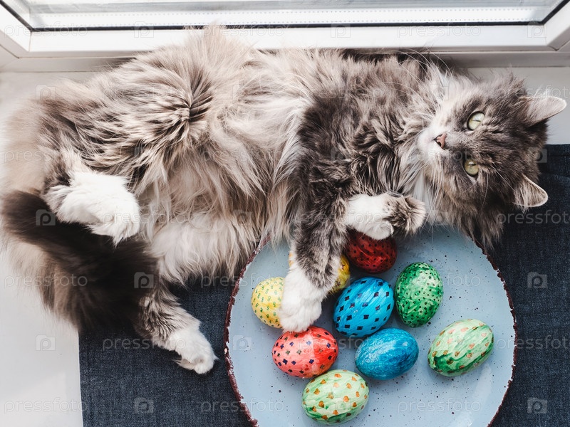 Пушистый серый кот рядом с тарелкой с разноцветными пасхальными яйцами