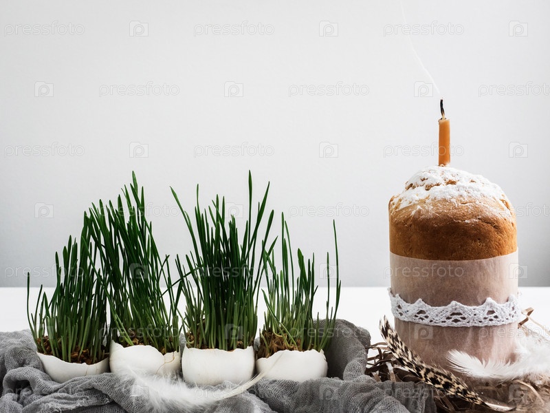 Кулич на фоне свежей, зеленой травы в горшках. Подготовка к Пасхе