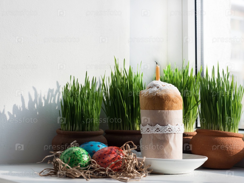 Кулич на фоне свежей, зеленой травы в горшках. Подготовка к Пасхе