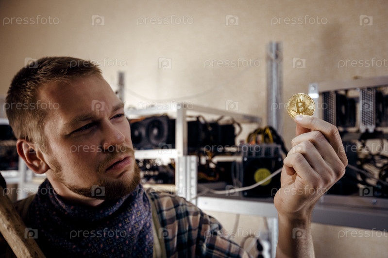 Человек с бородой держит золотую монету биткоина