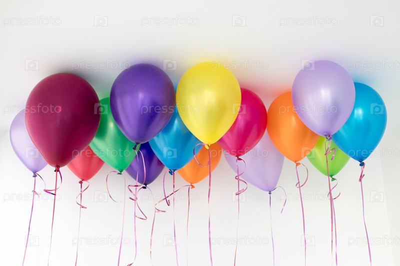 Яркие разноцветные гелиевые шары, висящие под белым потолком