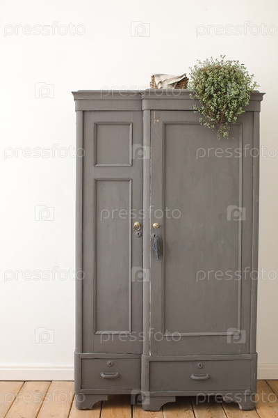 Серый старый шкаф в белом интерьере