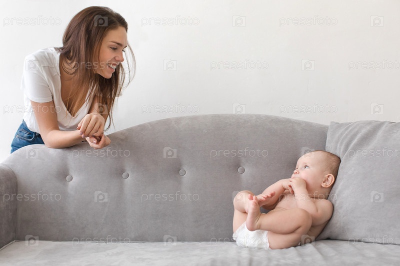 Женщина с ребенком на сером диване