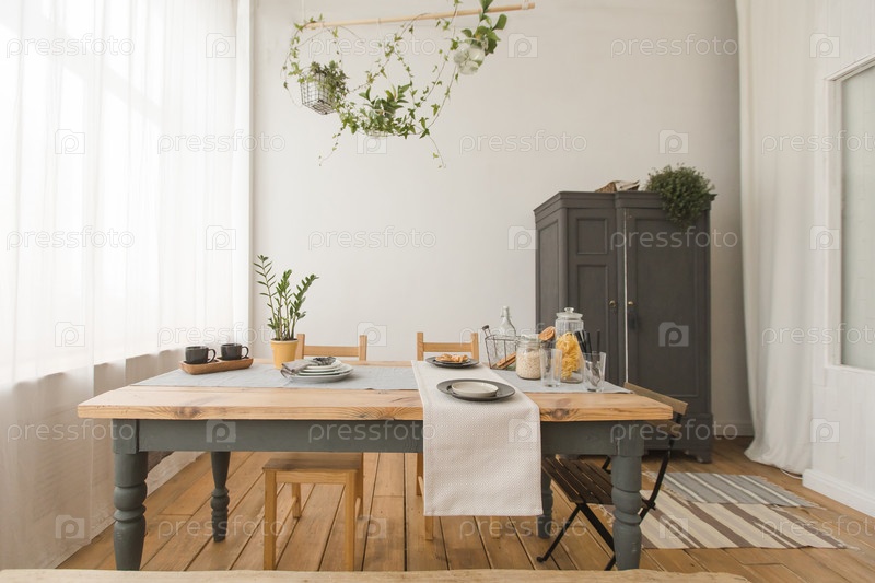 Уютный интерьер кухни с деревянным столом, шкафом и зелеными растениями в декоре