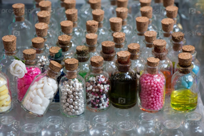 Набор маленьких прозрачных бутылок, наполненных бисером