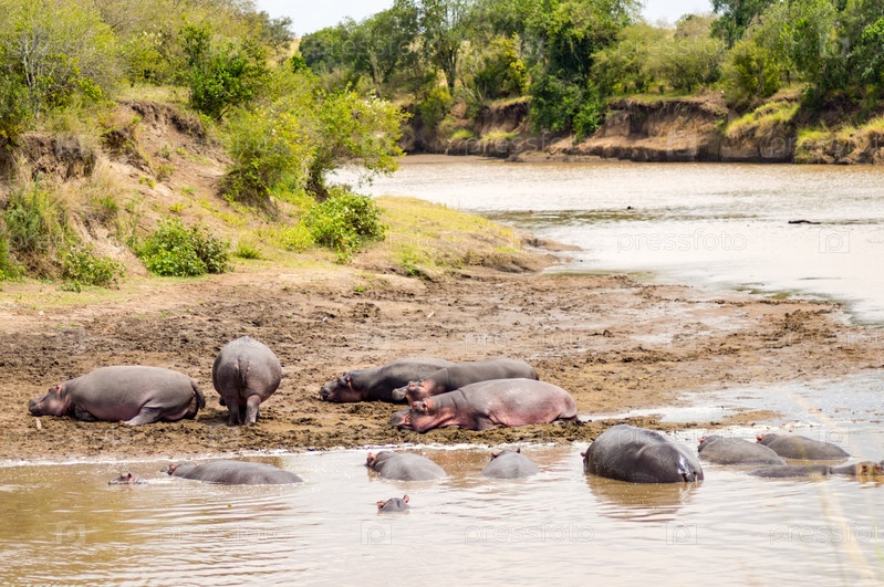 Стада бегемотов в реке Мара в Масаи Мара парка на северо-западе Кении