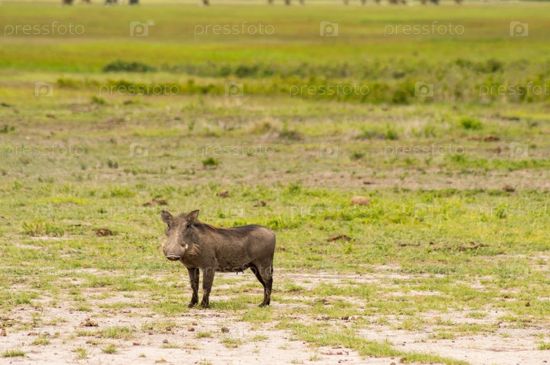 Несколько бородавочников в саванне в Кении