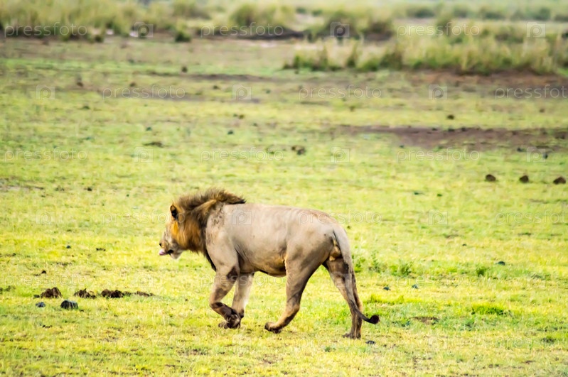 Старый лев в саванне Амбосели парк в Кении