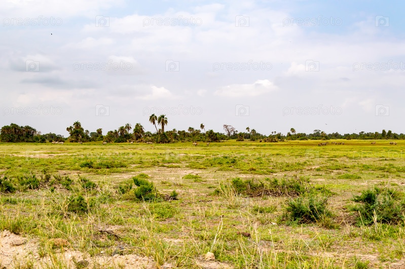 Вид на луг с папоротниками и пальмами в саванне Амбосели парк в Кении