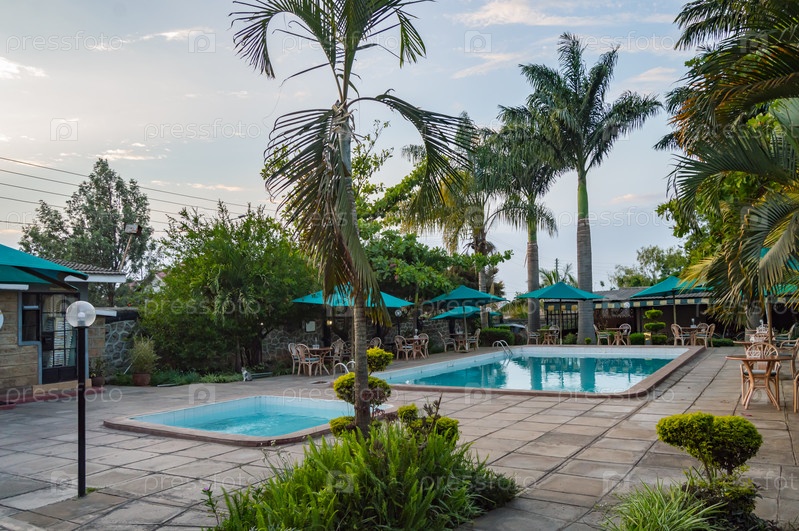 Бассейн и лягушатник в тропической обстановке с пальмами