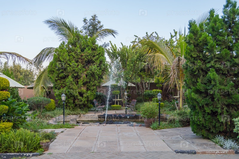 Тропический сад с распылителем воды и зонтиком в городе Найроби, Кения