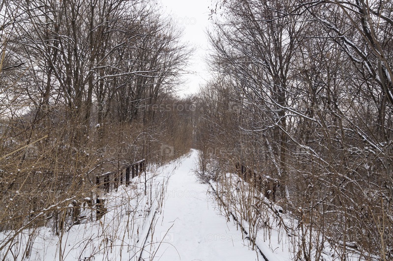 Мост на старой заброшенной железной дороги в зимнем лесу