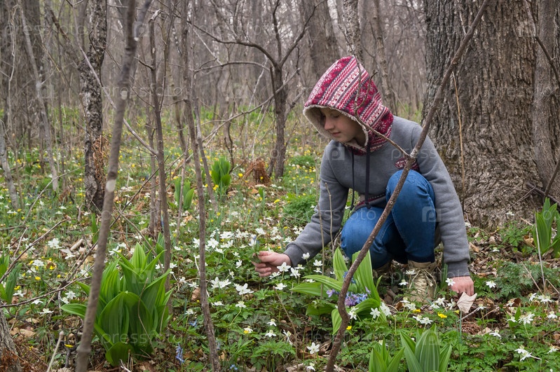 Девочка и первые цветы подснежники