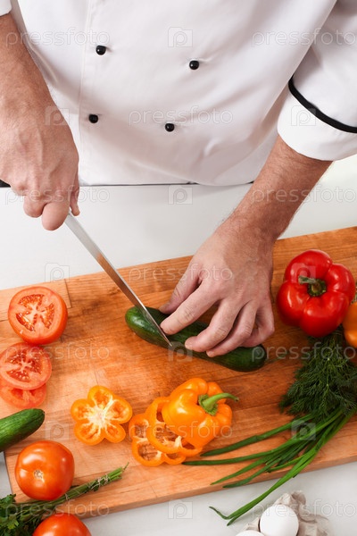 Изображение мужской руки с ножом, режущей помидоры на деревянной доске