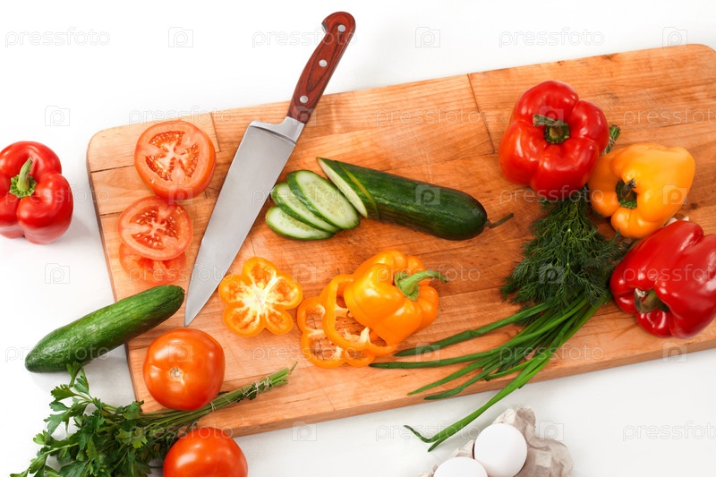 Изображение мужской руки с ножом, режущей помидоры на деревянной доске