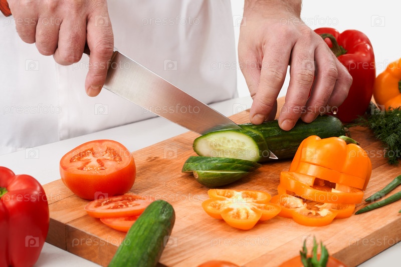 Изображение мужской руки с ножом, режущей помидоры на деревянной доске