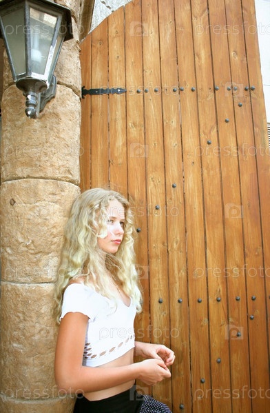 Молодая блондинка у деревянной двери