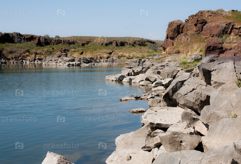 Берег озера с травой, белыми и красными скалами