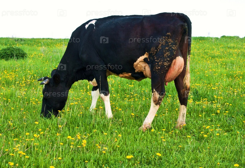 Корова пасется на зеленом лугу