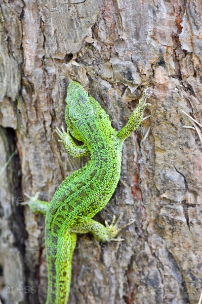 Изумрудная ящерица на сосне