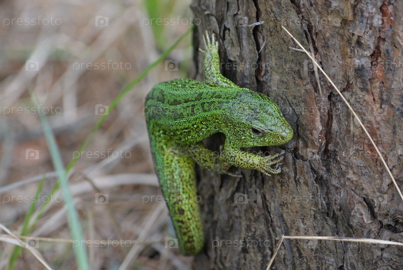 Зеленая ящерица на фоне сосновой коры