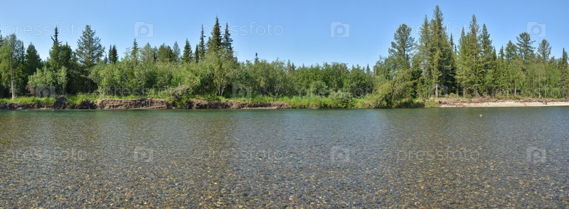 Летняя панорама таежной реки на Полярном Урале